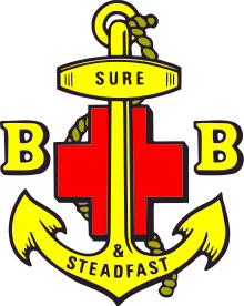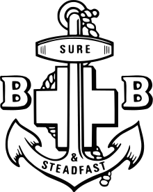 The crest was originally a plain anchor, bearing the BB motto with a capital 'B' on either side. Upon the merger between the Boys' Brigade and the Boys' Life Brigade in 1926, the red Greek cross was placed behind the anchor to form the current emblem.[3] The cross originally formed part of emblem of the Boys' Life Brigade.
