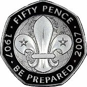 A 2007 British fifty pence coin commemorating the 100th anniversary of the founding of the Scout Movement